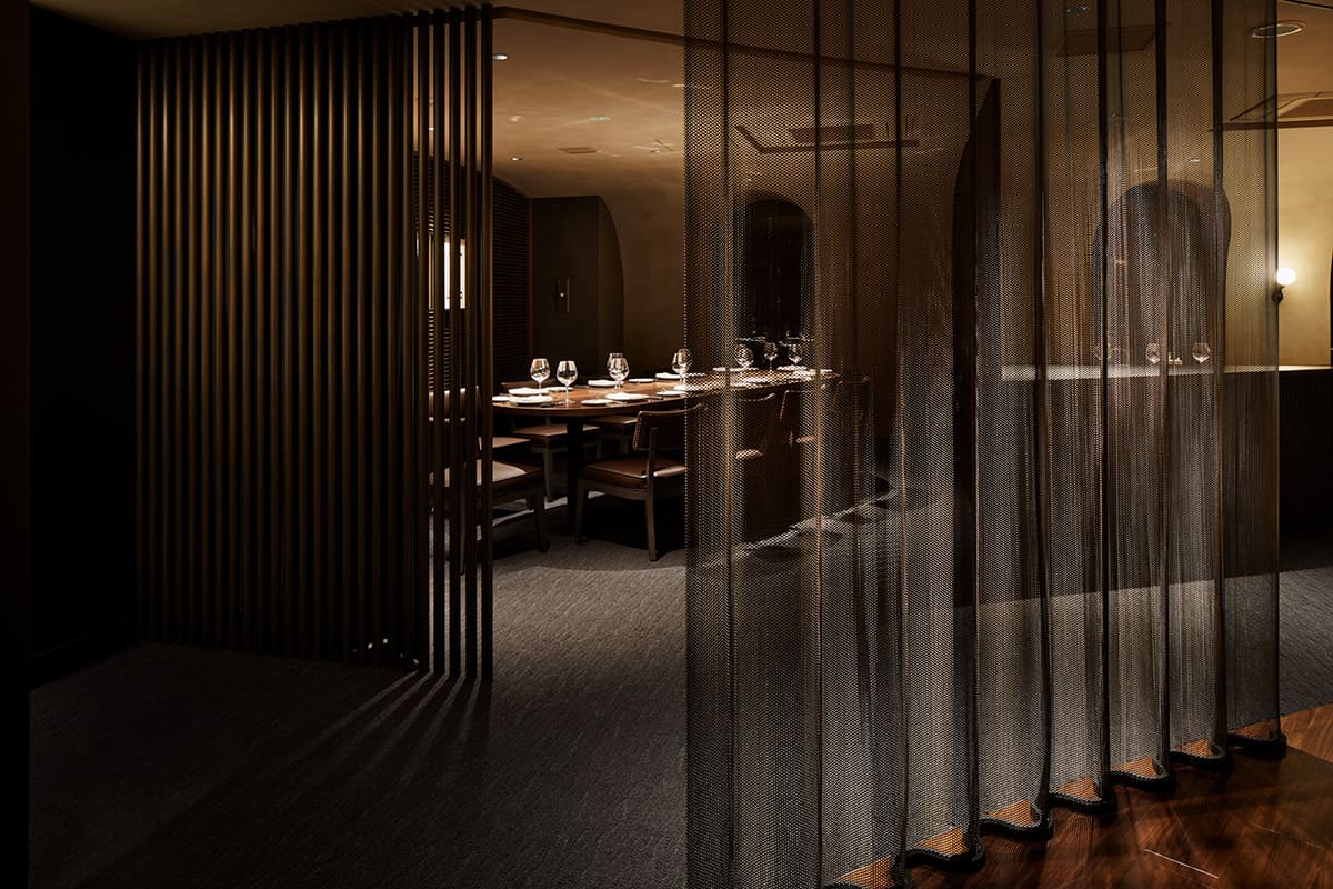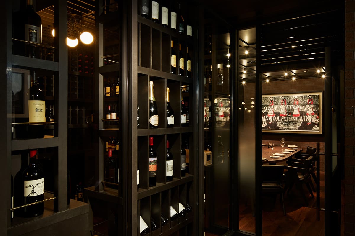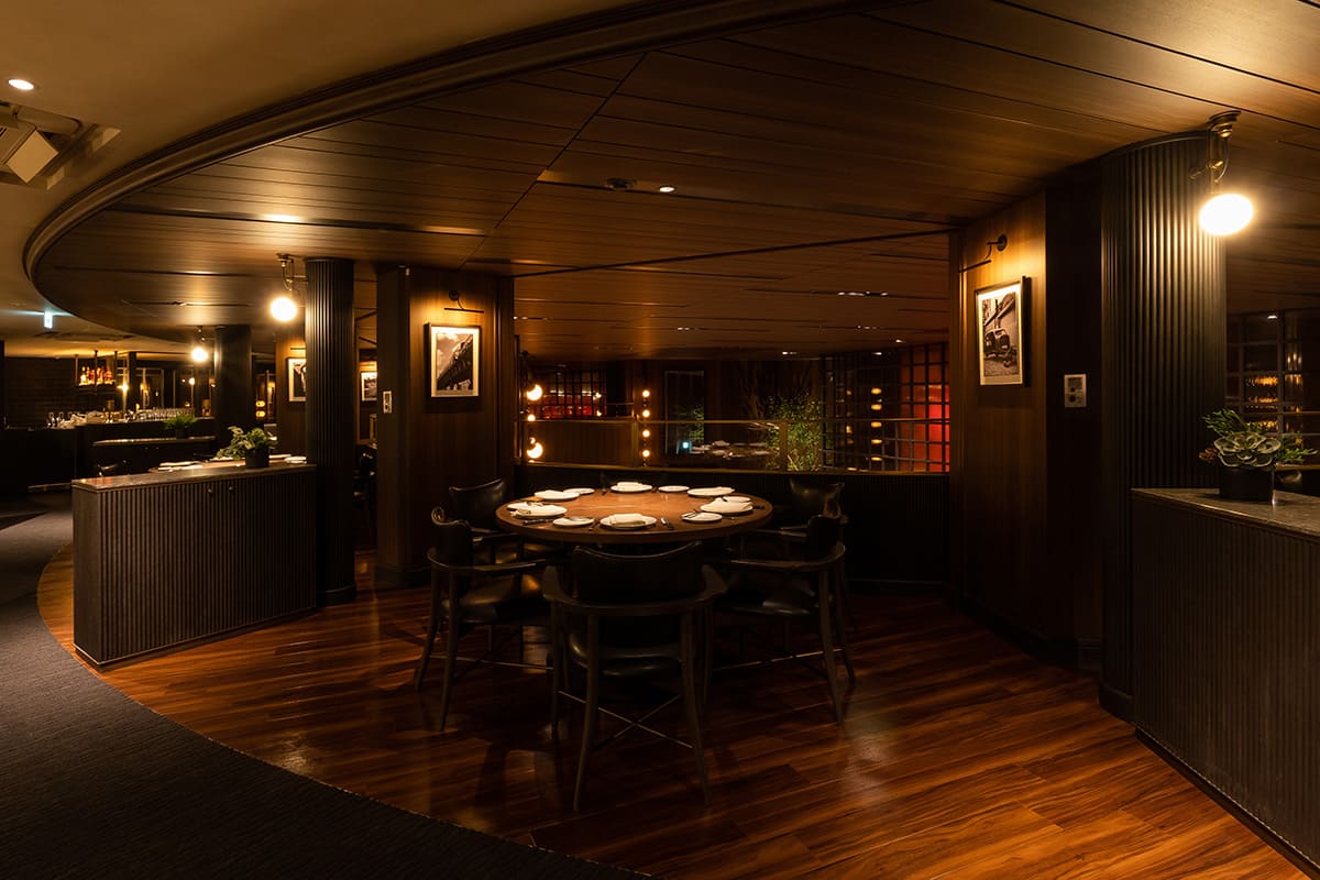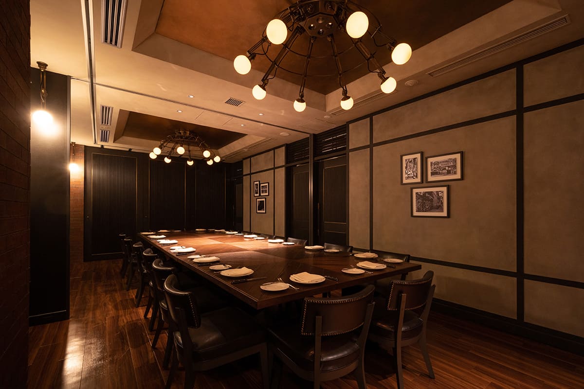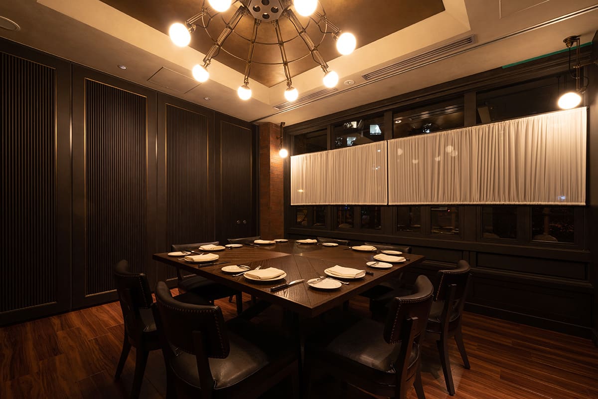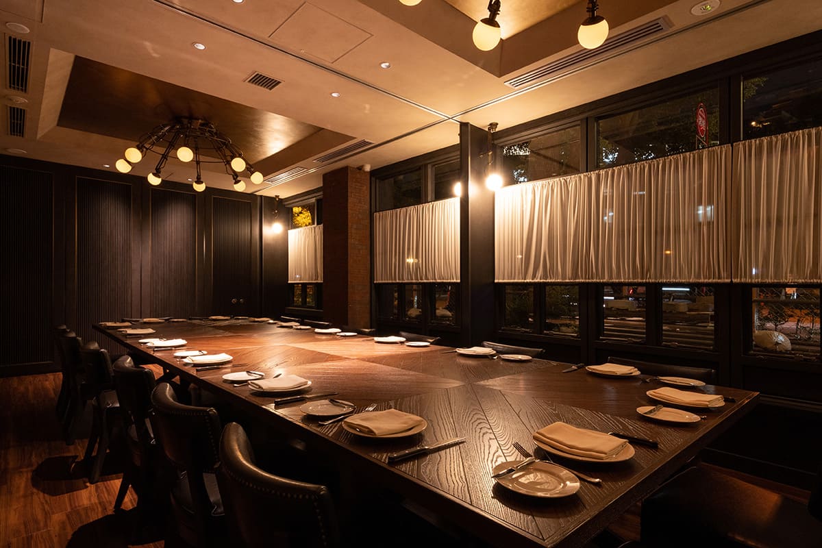 1階にはバーと8名様でご利用いただける4部屋の個室をご用意しています。お部屋はパーテーションによって繋げて使用することで、最大32名様までご利用いただけます。また、生肉、ケーキやオリジナル商品の販売をしているブティックも設け、持ち帰りやギフト用の商品をお買い求めいただけます。