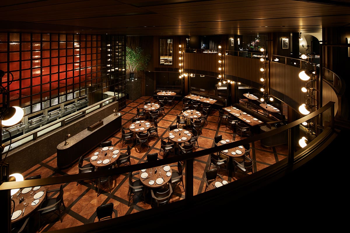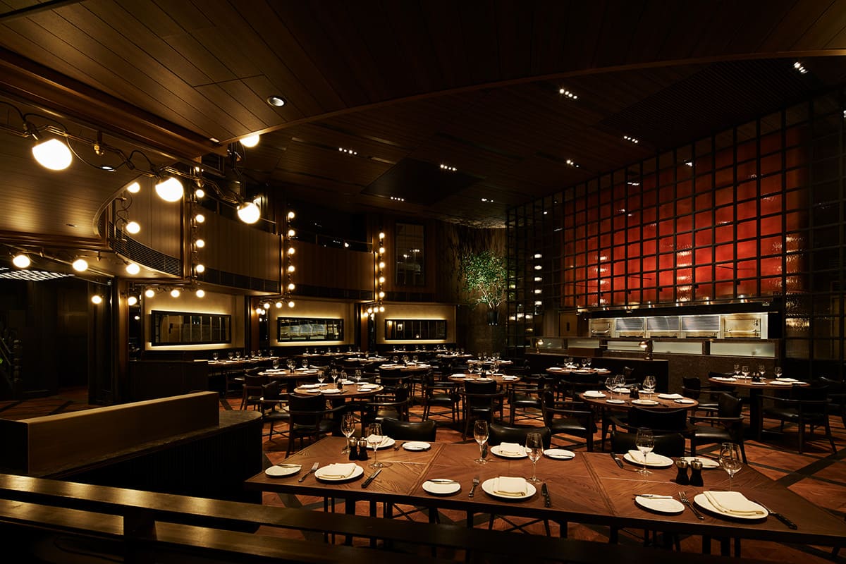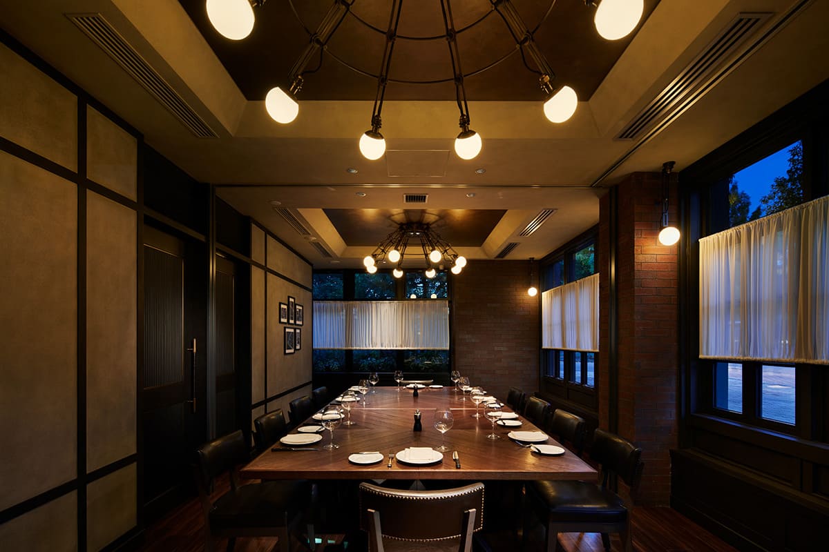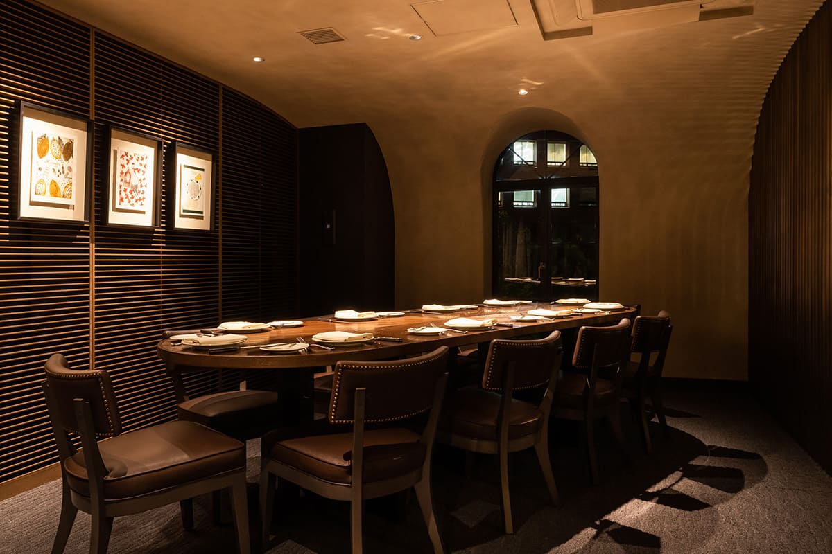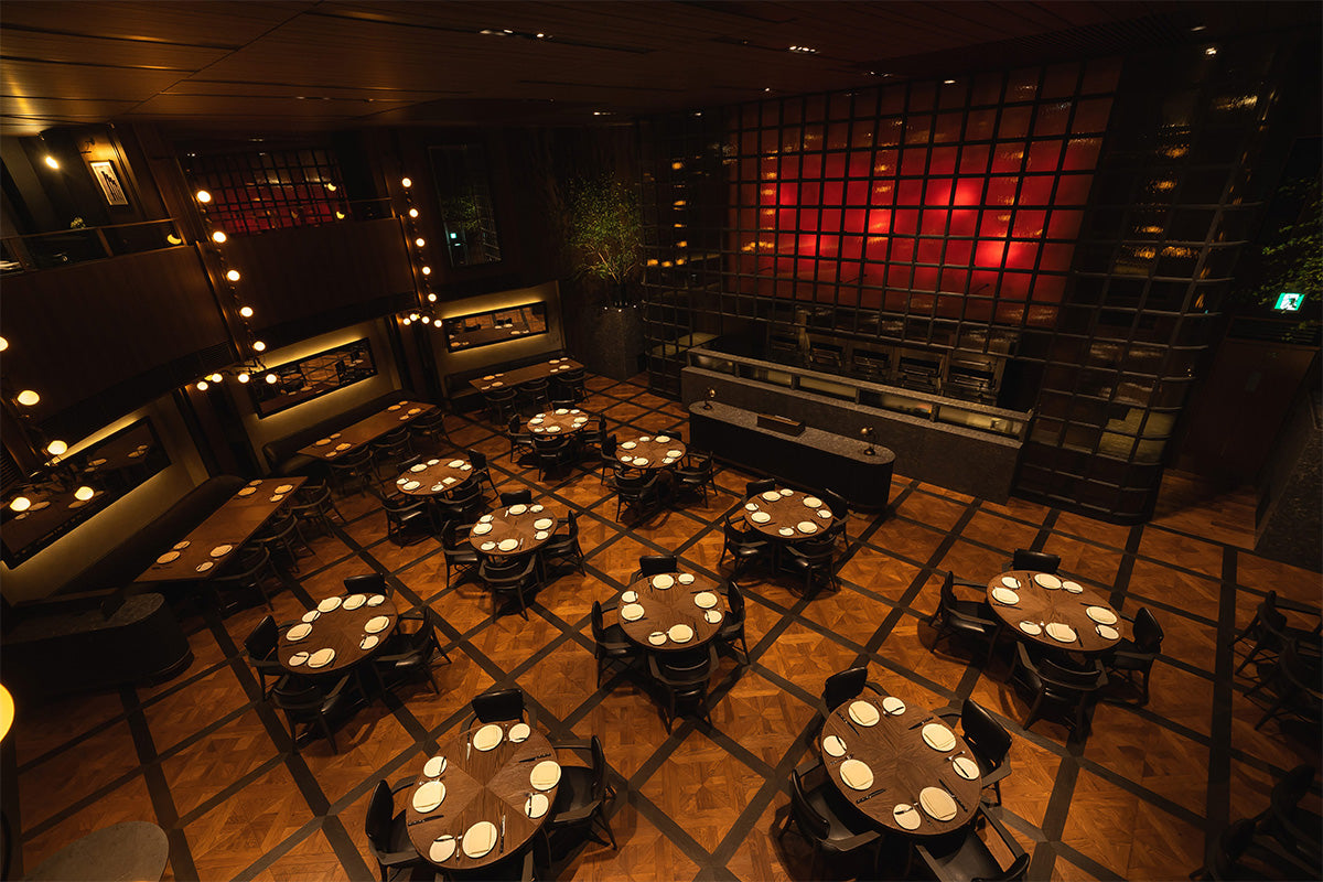 メインダイニングの2階は、オープンキッチンが備わった臨場感のあるフロアです。天井高6mの開放的な空間が広がっています。10名様でご利用いただける個室も1室ご用意しています。