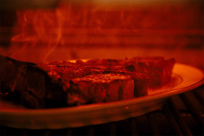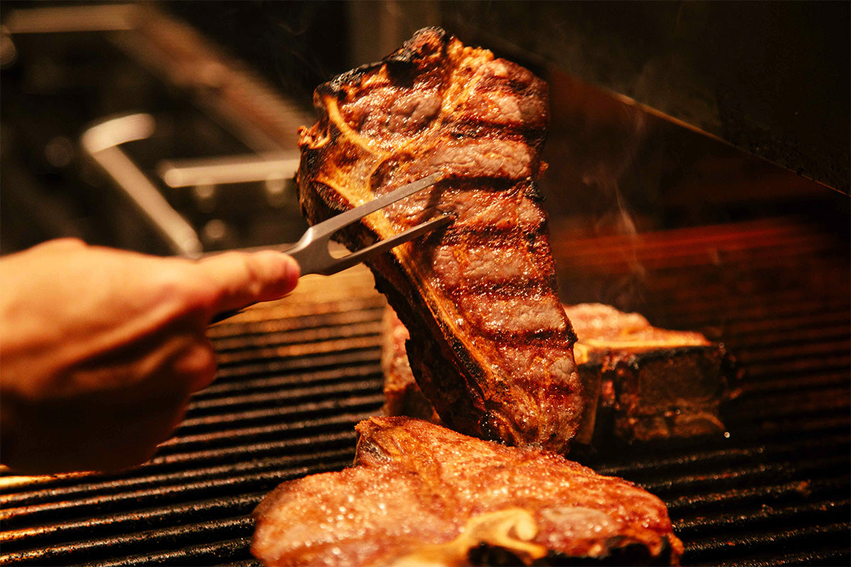 牛排在 500°C 的高温下烤制。然后将其放在加热到 100°C 以上的盘子上,盘子的边缘进一步加热肉。这不仅可以让您根据客人的喜好调整熟度,而且肉加热时的嘶嘶声也会激发他们的食欲。最后,倒入被称为“维生素”的肉汁,味道浓郁。