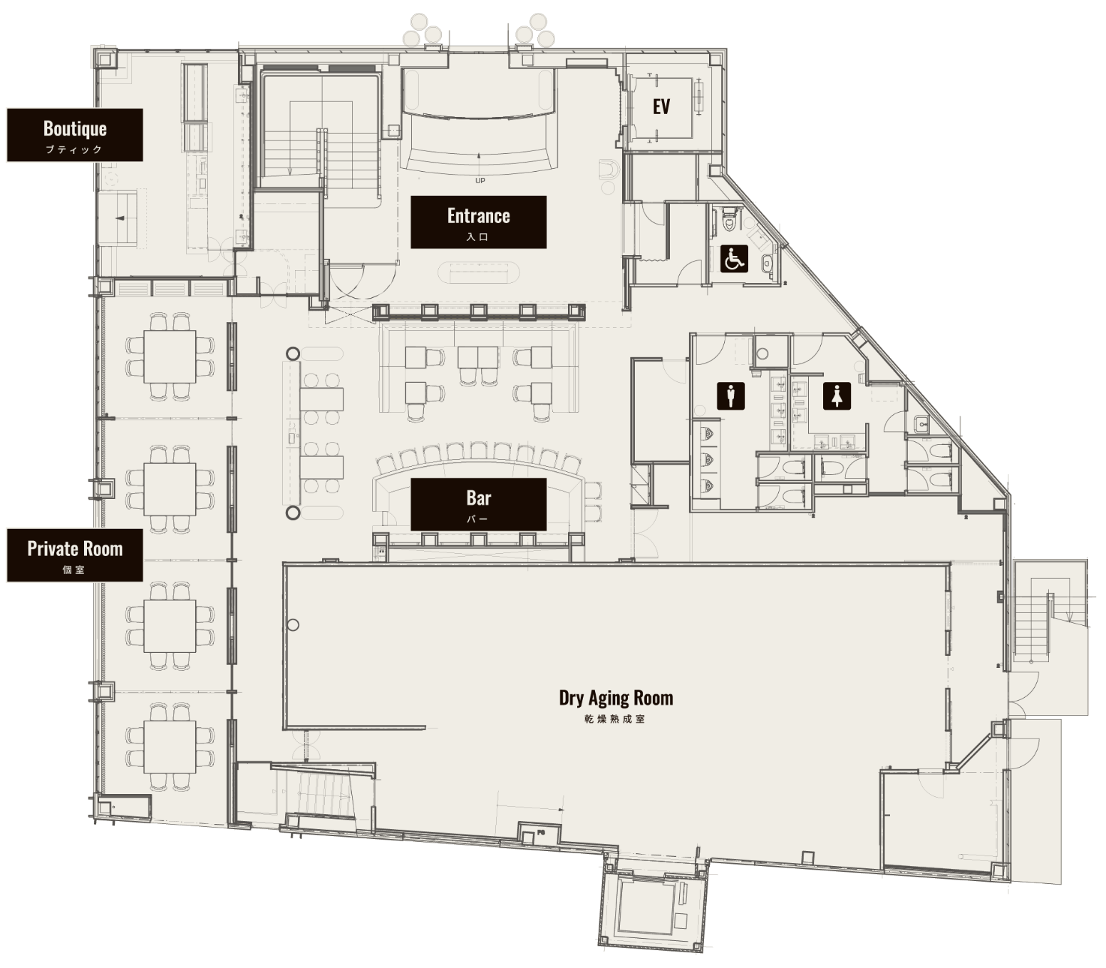 一楼设有酒吧和四间可容纳八人的包房。房间之间可用隔板连接,最多可容纳 32 人。还将设有一家精品店,出售新鲜肉类、蛋糕和原创产品,您可以购买商品带回家或作为礼物。