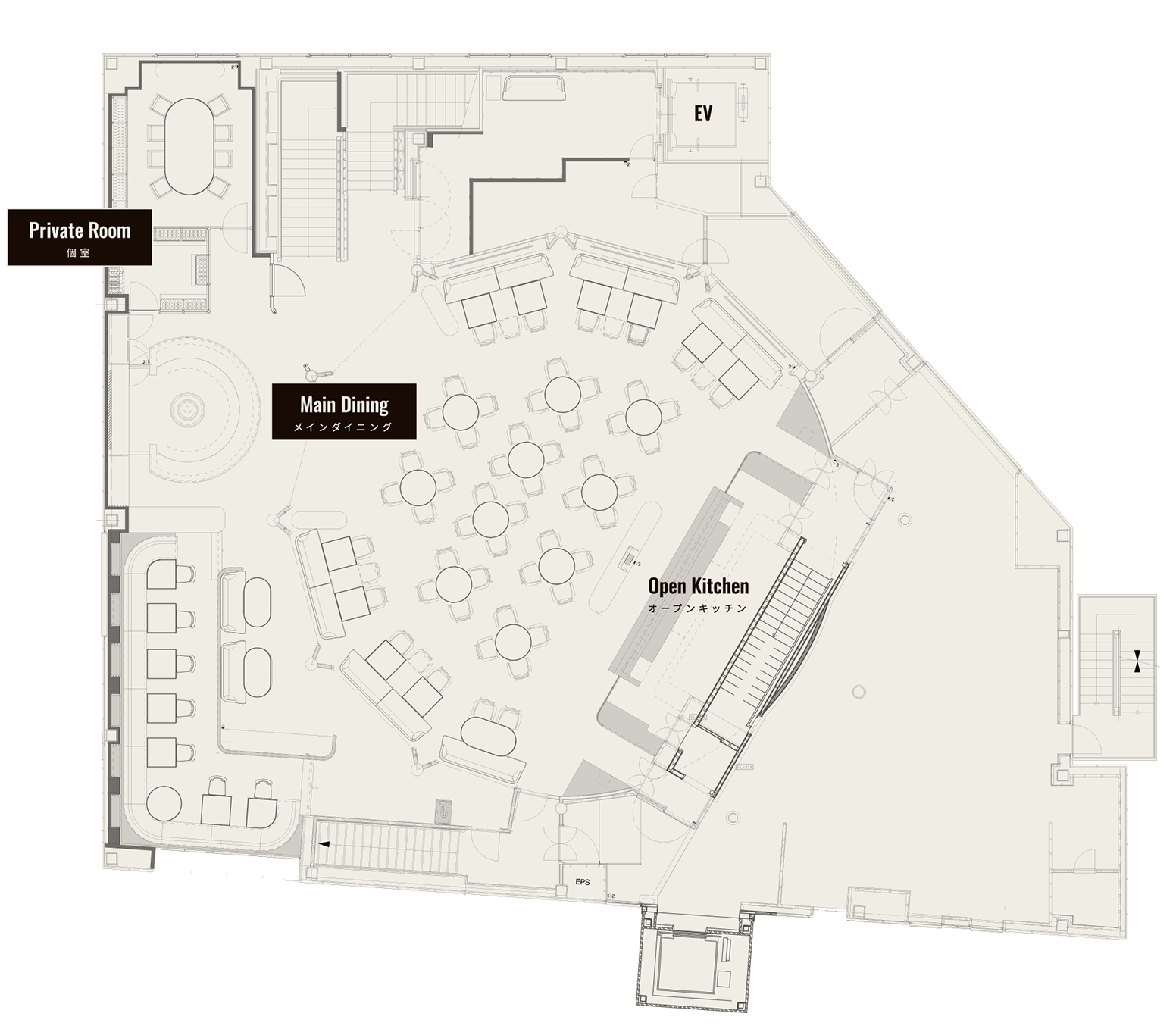 主餐厅二楼为沉浸式楼层,配备开放式厨房。该开放空间的天花板高度为6米。我们还有一间可容纳 10 人的私人房间。