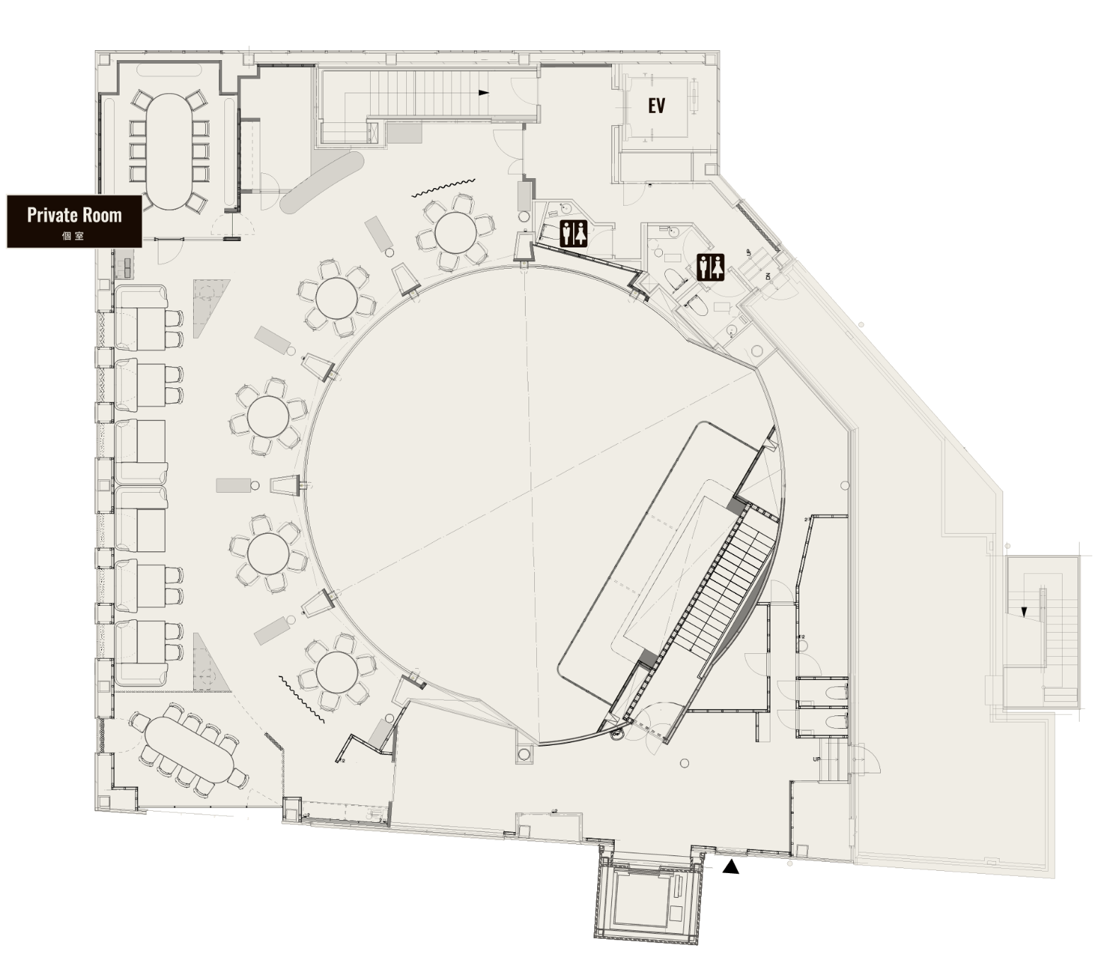 三楼的氛围更加轻松,您可以在这里享用餐点。餐厅的布局类似剧院,用餐者可以一边用餐一边俯瞰二楼的用餐区,就像坐在阳台上一样。我们还有一间可容纳 10 人的私人房间。